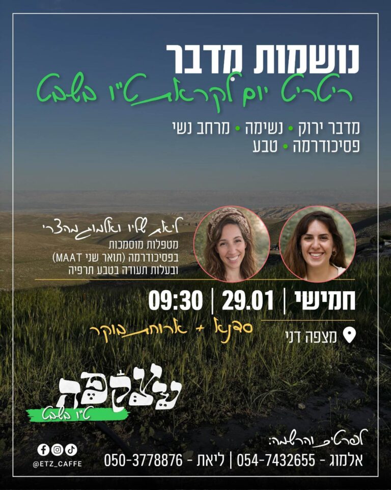 ריטריט- יש אותי! ריטריט בוטיקי לנשים במדבר – חופש | חיבור | תשוקה 24-26/3/26 3 ימים של חיבור לעוצמות שקיימות בכל אחת, חופש מהשגרה השוחקת,...